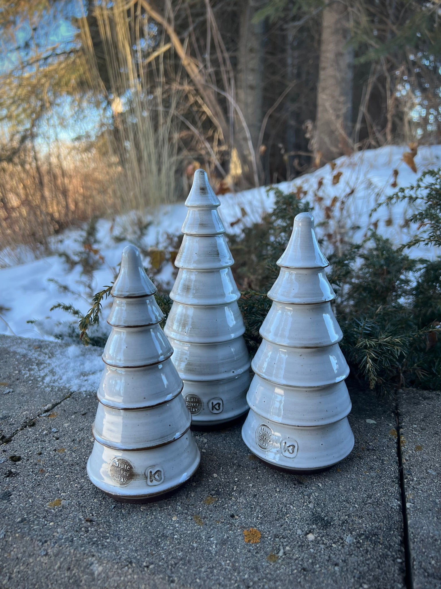 Set of 3 Trees. Each tree is unique, made individually on the pottery wheel. Glazed in a white glaze and then wiped back to reveal the natural beauty of the clay.